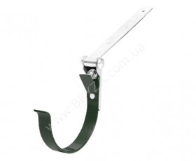 Держатель желоба прямой регулируемый, цвет зеленый / RAL 6020, служит для удержания желоба 125 мм, чаще применяется на тех кровлях, где не планируется использование лобовой доски и концы стропил остаются на виду. Держатель позволяет регулировать водосточный желоб по длине выступа со стропильной ноги и высоте крюка фиксируещего водосточный желоб.