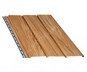 Софит (сайдинг) перфорированный, цвет золотой орех, используется для внешней отделки карнизов. Сайдинг обладает перфорацие1, для вентиляции подкровельного пространства. |