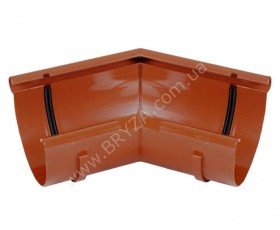 Угол желоба внешний, цвет кирпичный (оранжевый) / RAL 8004, предназначен для соединения водосточных желобов D 125 мм под внешним углом 135 градусов. В основном угол 135 градусов применяется для соединения желобов на пирамидальных кровлях. Внешний угол 135 градусов имеет 10-скатная пирамидальная кровля.